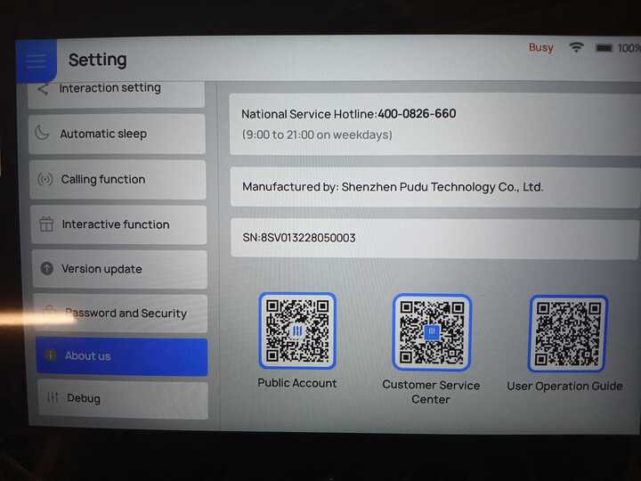 This robot is fully operational with very low usage—less than six full days equivalent of normal operation. Its motors and sensors have been inspected, and the software has been updated. Used robot in Good-Condition. Minor scratches are visible on the robot’s touchscreen. A long scratch runs across the Pudu logo on the front of the robot. There is also a medium-sized crack on the upper back section. Around the base, the robot shows some scuff marks and minor surface scratches, all cosmetic and non critical.